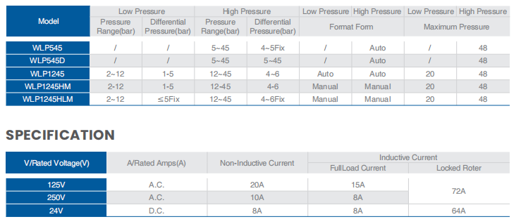 WLP series pressure control used in refrigeration and compressor airsystem, adjust the equipment is high,low limit control and avoid theoverlow suction pressure and over-hiah exhaust pressure.