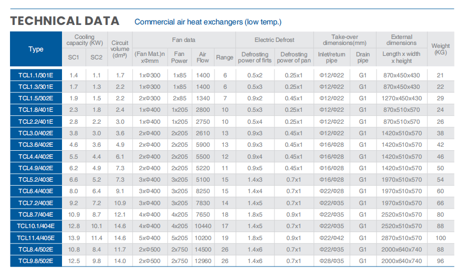 • The TCH、TCM、TCL series commercial heat exchangersare designed with European standards.Using 9.52 interna!threaded copper tube fork row arrangement, sine-wavepattern aluminum alloy fins, suitable for most Freonrefrigerants on the market.