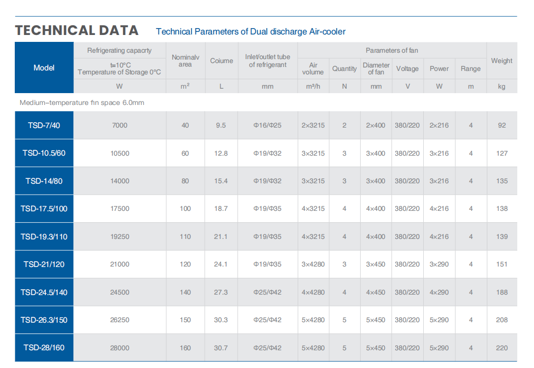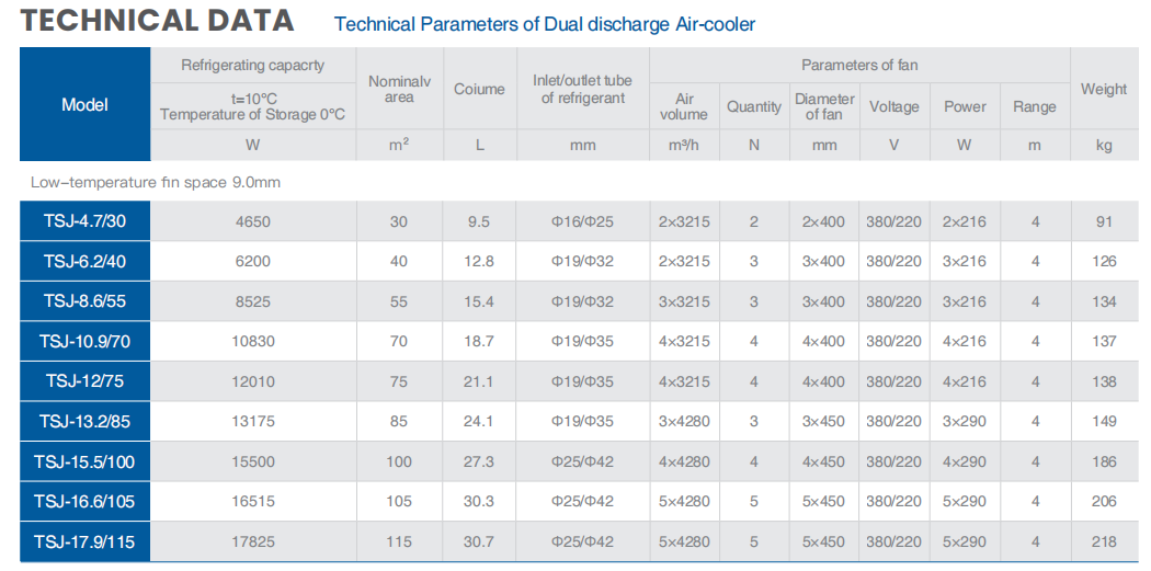These air – coolers are designed with different fin spacings (4.5mm for high – temperature, 6.0mm for medium – temperature, and 9.0mm for low – temperature scenarios). They boast high heat – exchange efficiency, with heat – exchange areas varying by model.